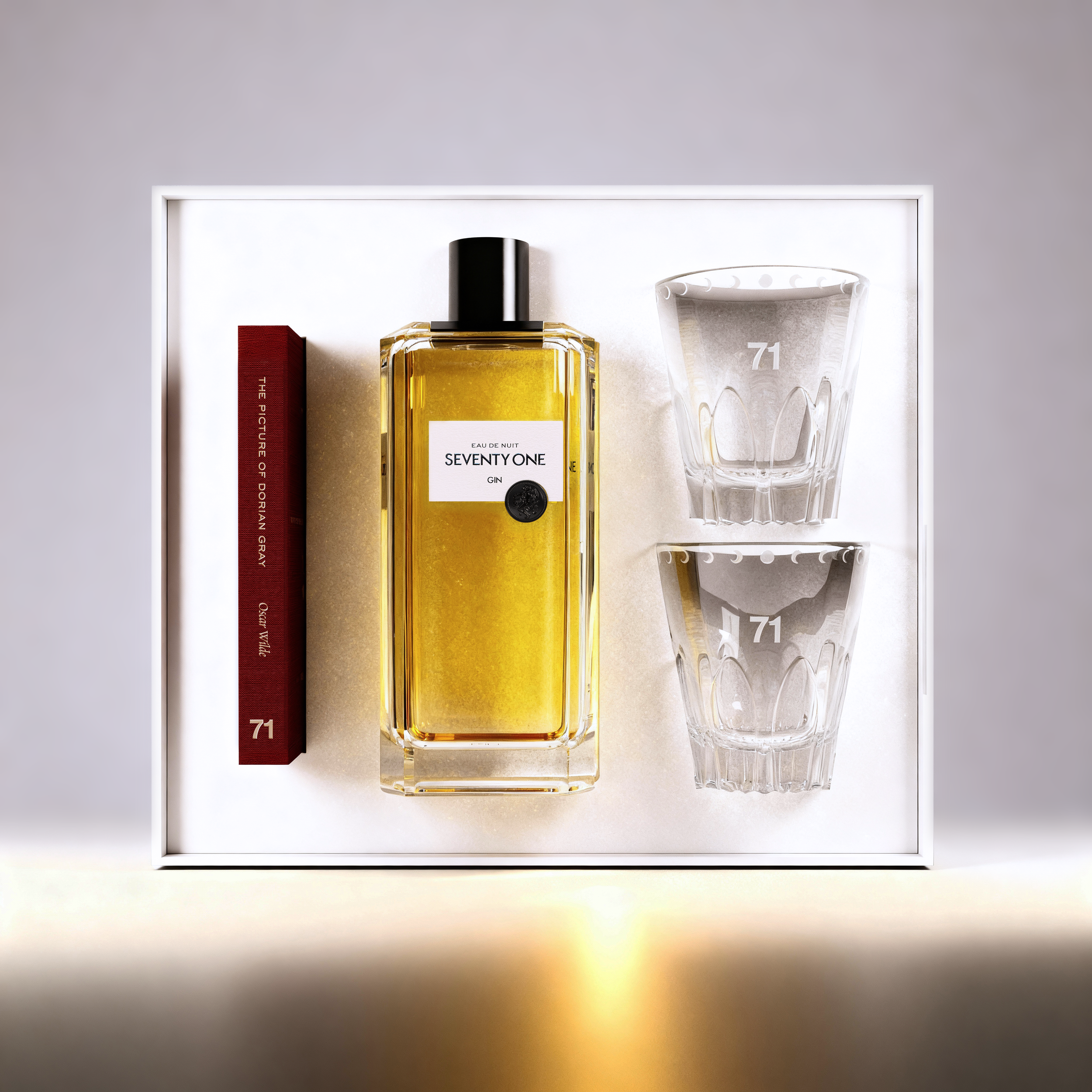 Styled product shot in collaboration with the client, arranging the Seventy One Gin bottle alongside a book and glasses to create a cohesive, lifestyle-focused composition.