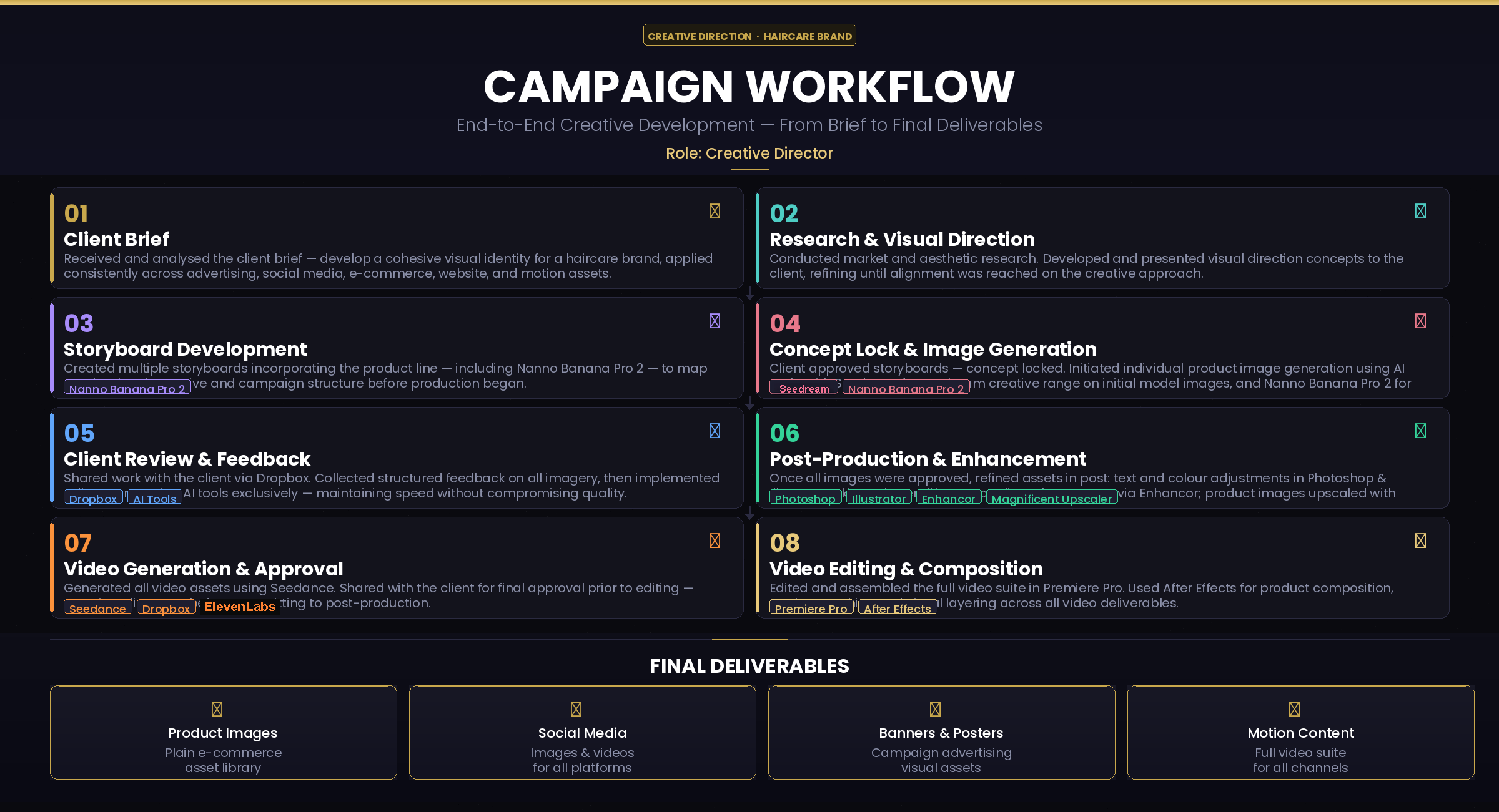 Client Brief: Develop a cohesive visual identity and creative direction for a haircare brand, applied consistently across advertising, social media, e-commerce, website, and motion assets to support marketing campaigns and strengthen brand presence.