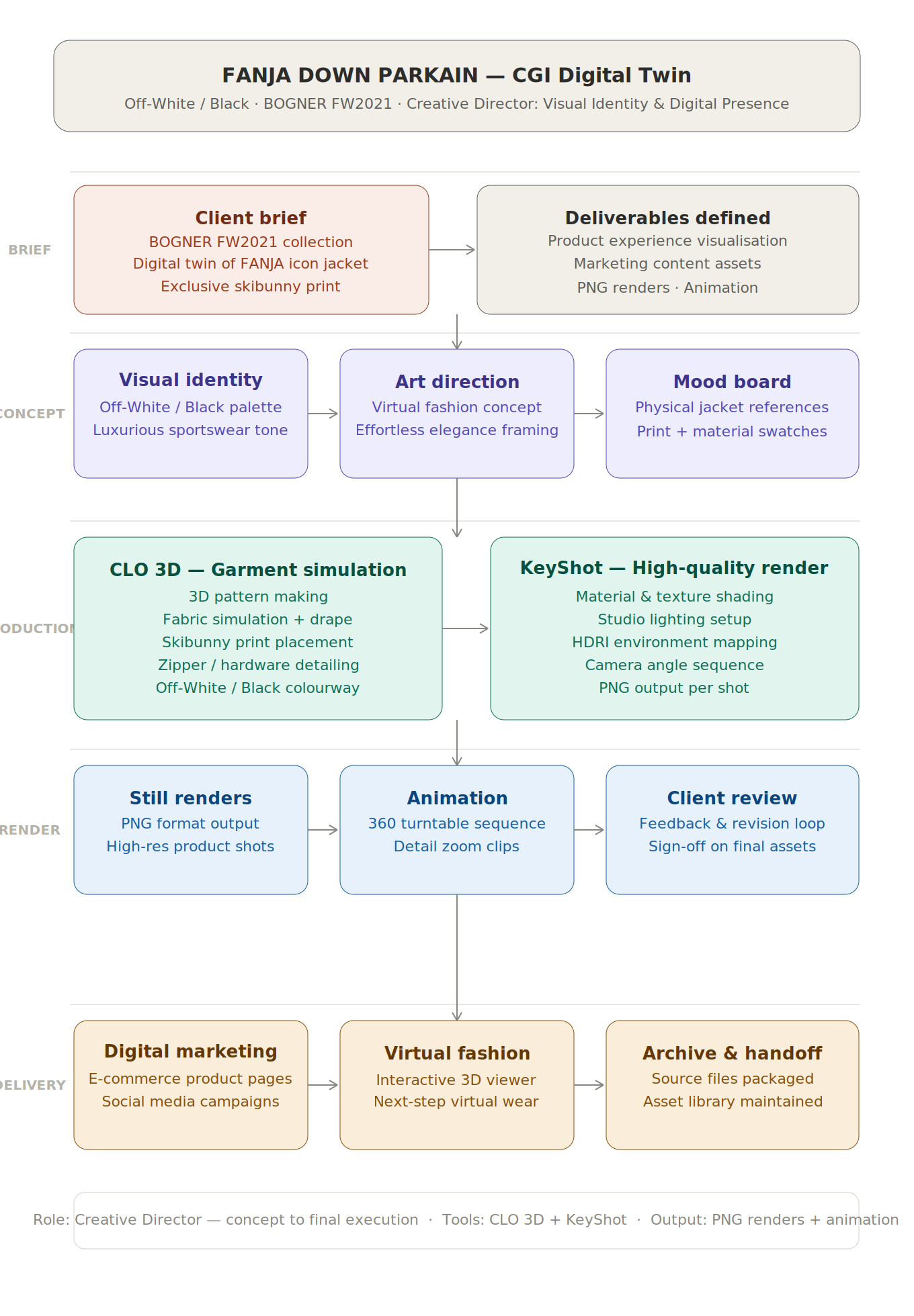 Process & Contributions: Developed as a digital twin, this CGI project was produced in CLO3D and KeyShot for high-quality rendering and animation.