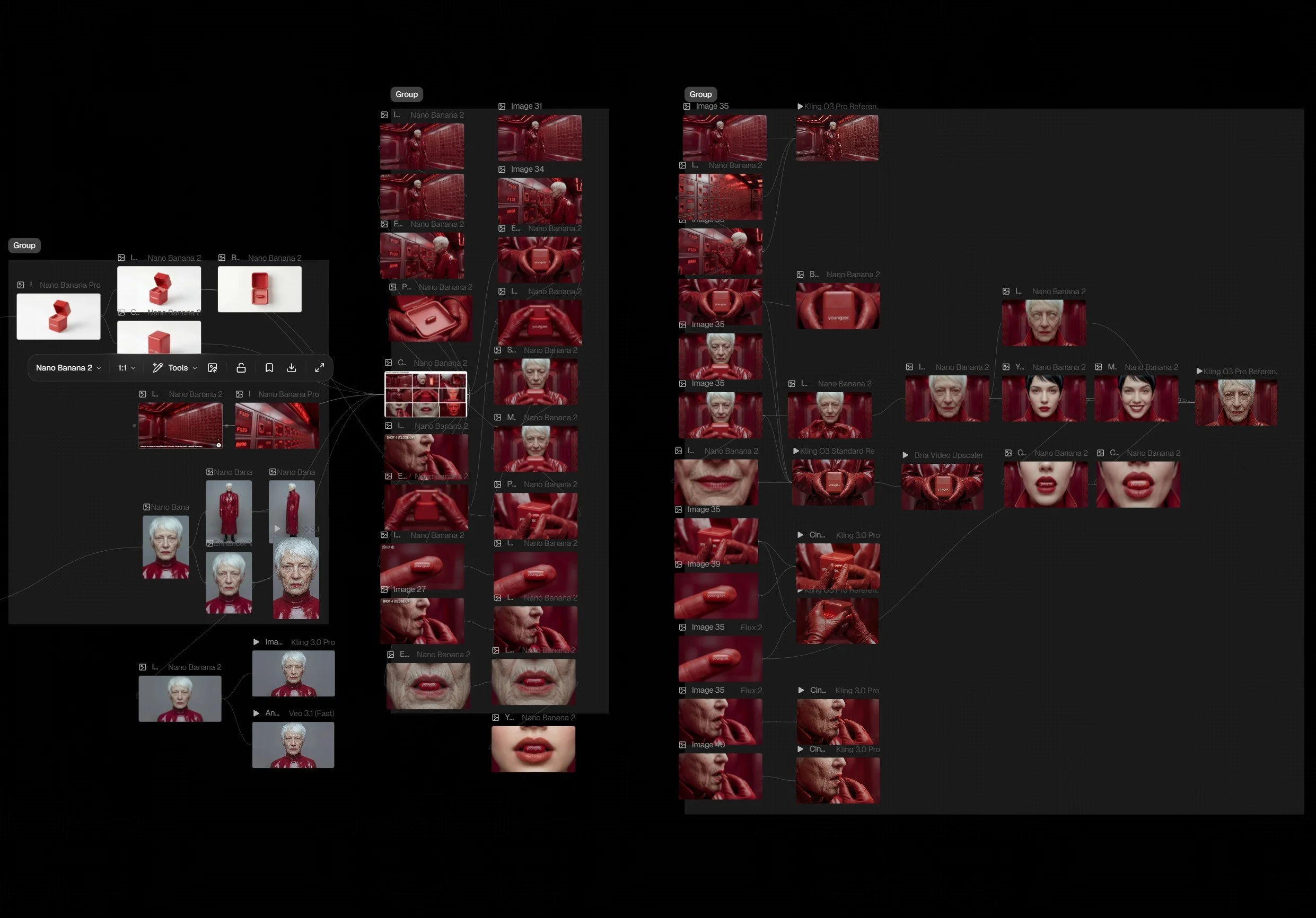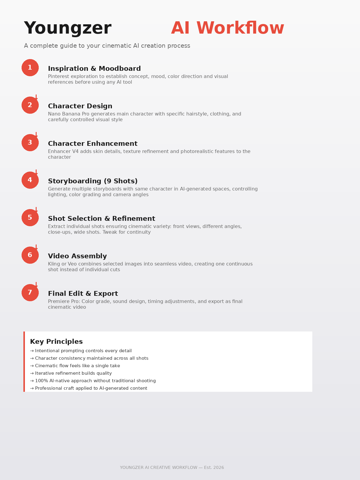 Purpose and Process: Experimental Project using only AI. This project was created to push the boundaries of AI and create smooth transitions between scenes, making it appear as one continuous shot achieved with AI tools rather than traditional methods. The project was executed using FLORA in a systematic AI workflow. Character was carefully prompted for hairstyle, clothing, and visual style, then placed in AI-generated spaces to create a cohesive storyboard with a specific mood and vibe. Prompts were intentionally crafted to control color grading, lighting, camera angles, and shots. The final output was generated as video sequences from selected images, producing a seamless, cinematic result.